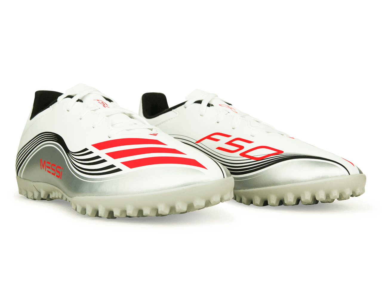 Step up your game with the adidas Men’s F50 Club Messi TF in White/Red/Silver. Built for quick moves and sharp control, these cleats feature a textured synthetic upper for a better touch and a perforated tongue for lasting comfort. The lugged rubber outsole offers reliable grip on turf, helping you stay fast and focused on every play.