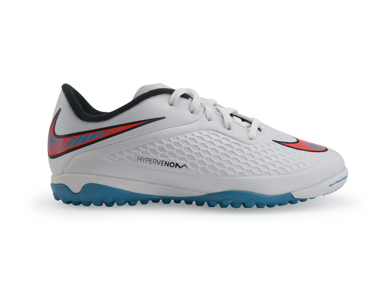 Built for agility, the Nike Jr. HyperVenom Phelon (TF kids Turf Football Boot delivers the responsiveness attacking players need on turf surfaces. Anatomical design mirrors the shape of the foot for a locked-down fit. Shortened eyestay area increases the size of the strike zone. Rubber outsole has an agility traction pattern for responsiveness on turf. Synthetic Leather