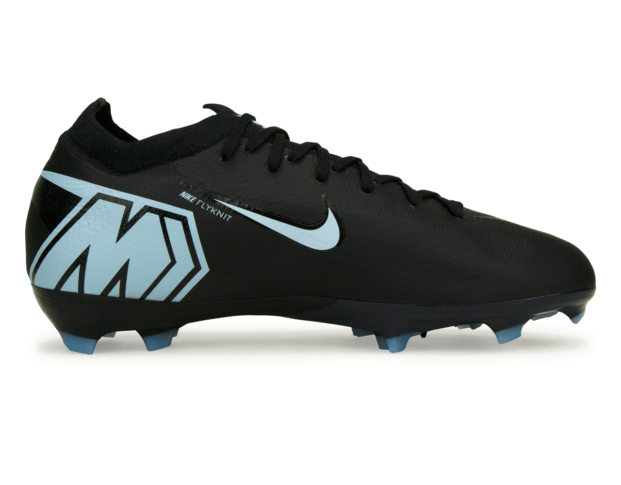 The Nike Kids Zoom Mercurial Vapor 16 Pro FG in Black/Ice Blue combines standout style with top-tier performance for young players. Featuring a vibrant multicolor Flyknit upper, it ensures a lightweight, secure fit. The Air Zoom cushioning provides excellent comfort and responsiveness, while the textured surface improves ball control. Equipped with a firm-ground plate, this cleat offers dependable traction for fast, confident play on natural grass.
