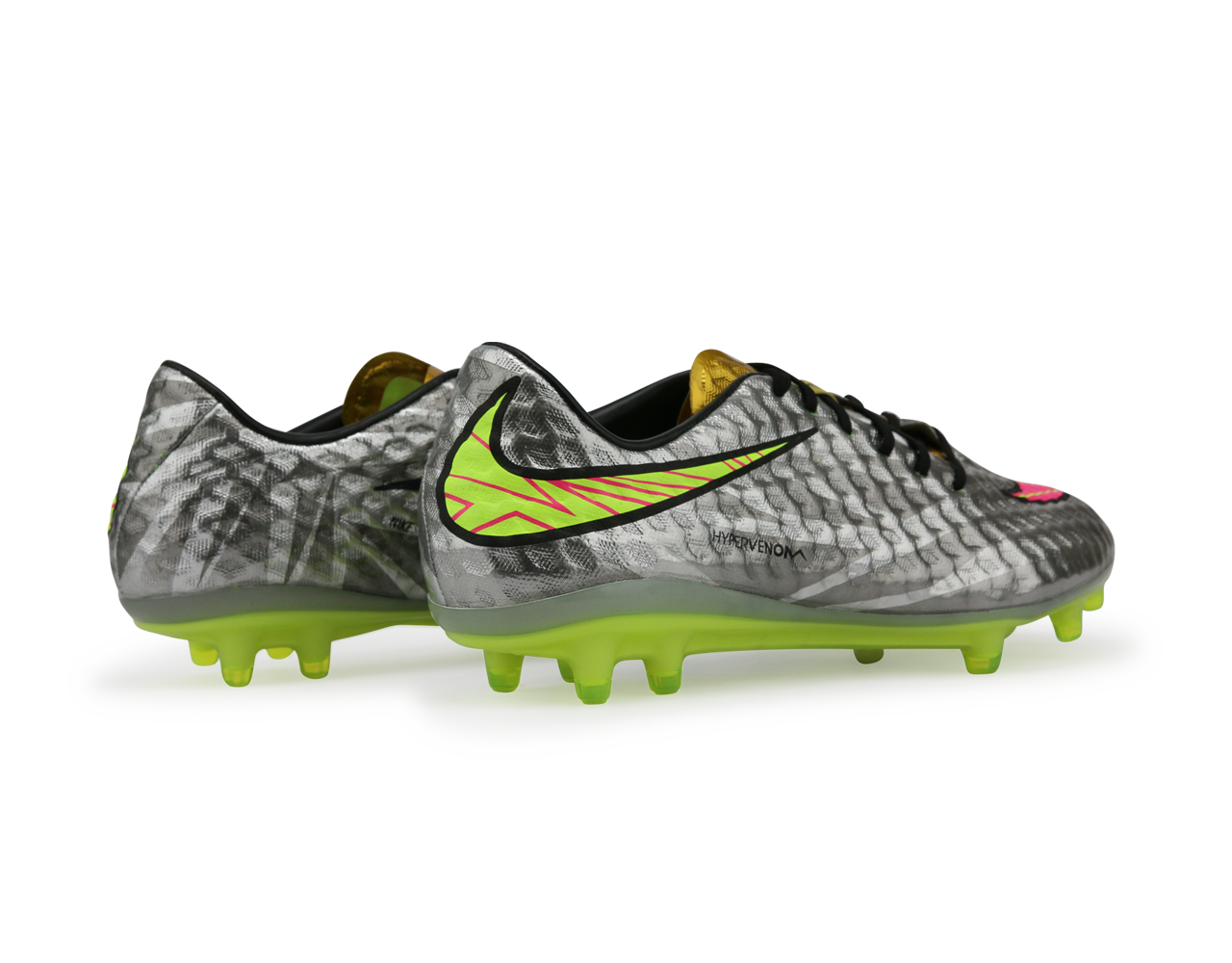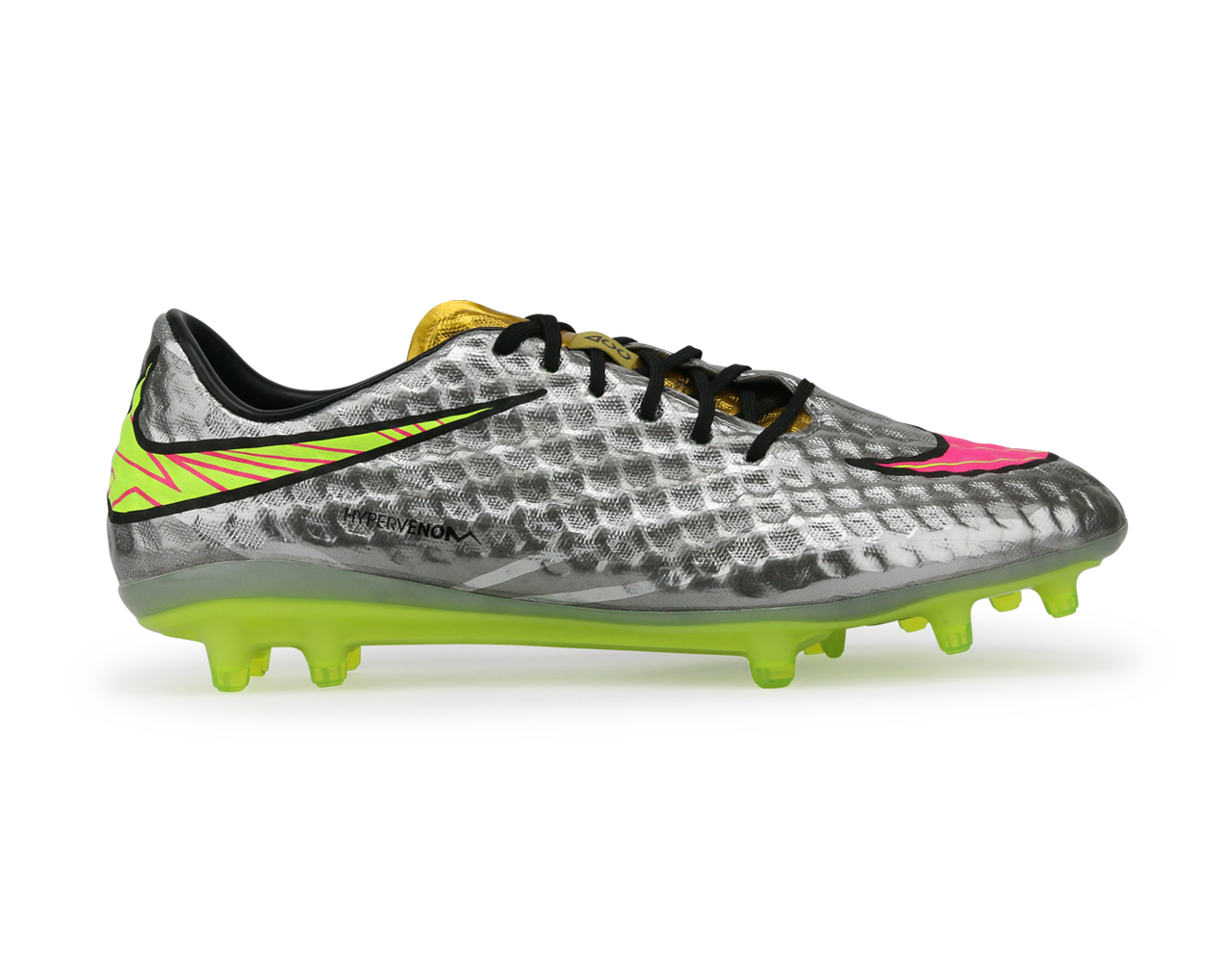 Inspired by the body art of one of Brasil’s best, the Men’s Neymar Hypervenom Phantom II (FG) Firm-Ground Football Boot brings bold Neymar graphics to the pitch, and helps you back them up with a foot-hugging Dynamic Fit collar and a micro-textured upper for amplified touch. Dynamic Fit collar and fused Flywire cables for a seamless, locked-down fit. NIKESKIN technology and textured upper amplify touch. Split-toe plate has an agility traction pattern for quick response.