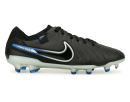 The Nike Men’s Tiempo Legend 10 Pro FG Black/Chrome/Royal cleats are designed for the dedicated player. Crafted with innovative FlyTouch Pro engineered leather, they’re softer than natural leather, ensuring a close fit that works seamlessly with the All Conditions Control technology for optimum grip in any weather. These cleats are the lightest and sleekest in the Tiempo series, suitable for any position on the field. Notable features include microdots on the upper that enhance touch zones for precise ball control, a reduction in foam pods from the previous model for closer ball contact, and a traction-optimized plate with conical studs for stability and agility. The knit inner sleeve ensures a secure and comfortable fit.