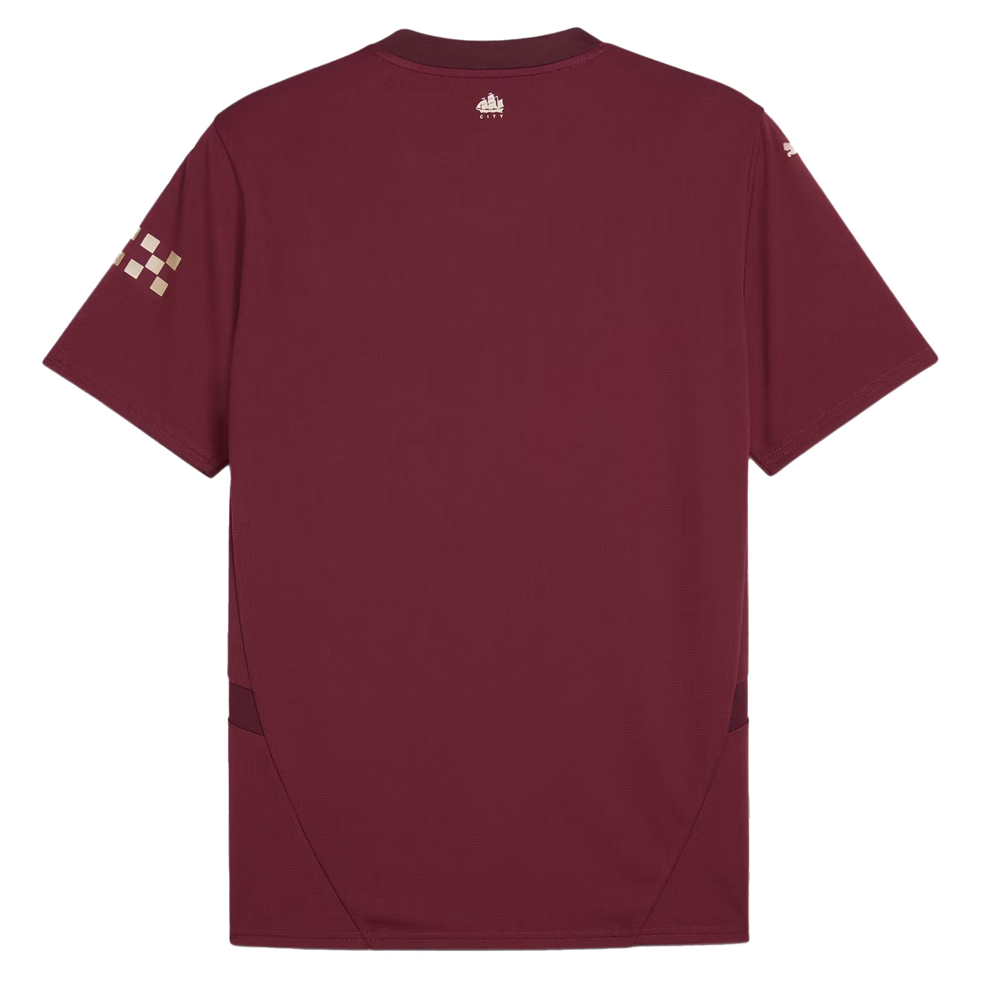 The PUMA Men’s Manchester City 2024/25 Third Jersey in Dark Jasper pays tribute to the club’s constant movement on and off the pitch. The jersey features an all-over graphic inspired by the ship from the Man City badge, symbolizing the club’s past, present, and future. Designed for fans, this replica jersey combines the match-worn look with a casual silhouette, perfect for both game day and everyday wear.